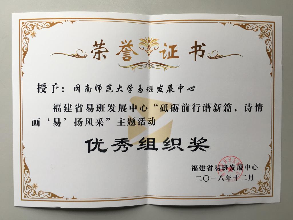 近日,福建省易班發展中心公布“‘寓’見美好,‘易’滿溫情”和“砥礪前行譜新篇,詩情畫‘易’揚風采”兩項主題活動的結果,我校易班發展中心在兩個活動中分別榮獲“優秀組織獎”。