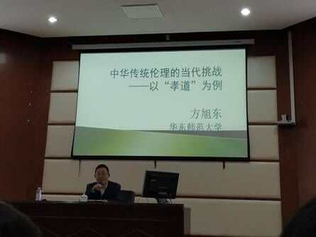 3月10日上午,我校傳統(tǒng)文化與核心價(jià)值觀講堂系列講座第78講在東區(qū)報(bào)告廳舉行。華東師范大學(xué)哲學(xué)系教授、博士生導(dǎo)師方旭東為我校師生作了題為《中華傳統(tǒng)倫理的當(dāng)代挑戰(zhàn)——以“孝”道為例》的講座。方旭東教授首先從比較學(xué)的維度,系統(tǒng)分析了中華民族重孝道的倫理特色,列舉了不同宗教、不同國(guó)家對(duì)于“孝”的基本看法與實(shí)踐表征。接著講解了中國(guó)傳統(tǒng)孝文化的內(nèi)涵,分析了科技進(jìn)步、社會(huì)演化對(duì)“孝道”在內(nèi)的中華傳統(tǒng)倫理帶來的嚴(yán)峻考驗(yàn)。他指出,這些新現(xiàn)象、新變化對(duì)傳統(tǒng)倫理帶來前所未有的挑戰(zhàn),同時(shí)也影響到整個(gè)人類社會(huì)的未來走向。