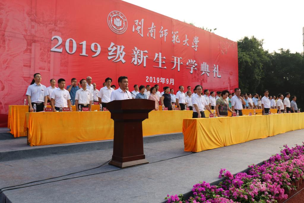 在舉國上下喜迎中華人民共和國成立70周年之際,9月9日上午,我校在東區田徑場隆重舉行2019級新生開學典禮。來自全國各地的5110名本科生、317名碩士生、9名博士生開啟新的人生征程。校領導吳彬鏹、鐘發亮、肖慶偉、何紹福、蔣一婷、黃來淵、林致遠、張龍海等全體在家校領導出席典禮,學校各機關、教輔單位主要負責人,各學院黨政主要負責人,附屬學校負責人,教師代表、新生輔導員和部分新生家長參加典禮。開學典禮由校黨委副書記鐘發亮主持。