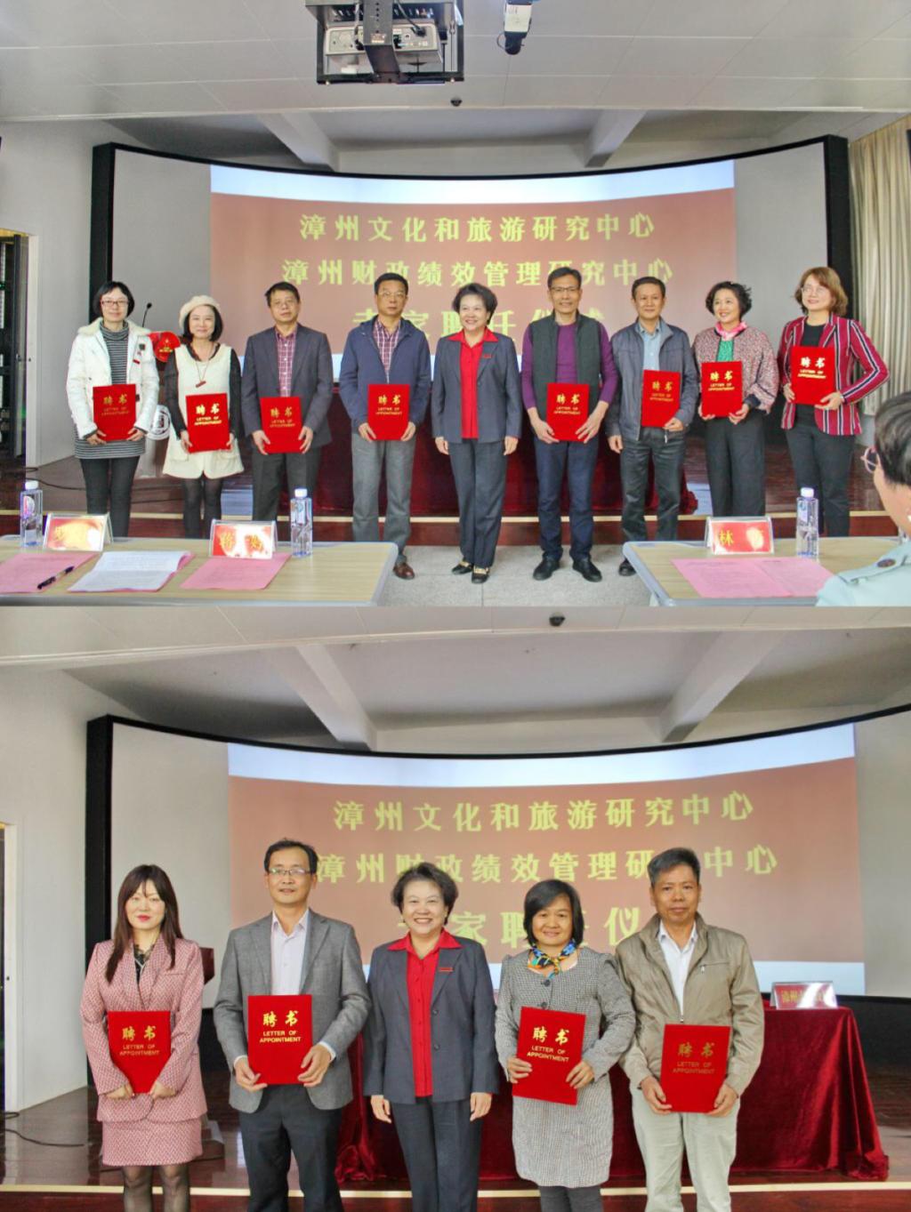 漳州市財政局副局長施曉瑩、漳州市商務局副調研員林水福和我校商學院院長張惠萍共同簽訂合作協議。漳州市文化和旅游局局長林菁、漳州市旅游投資集團有限公司總經理楊志濱共同為漳州文化與旅游研究中心揭牌;漳州市財政局副局長施曉瑩、我校黨(校)辦主任羅炎成共同為漳州財政績效管理研究中心揭牌。蔣一婷分別為漳州文化和旅游研究中心、漳州財政績效管理研究中心專家代表頒發聘任書。