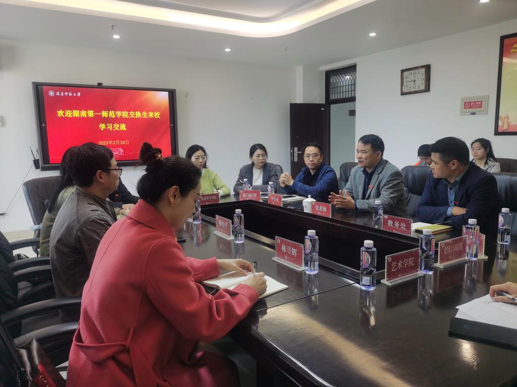 2月24日上午,湖南第一師范學院3位帶隊老師帶領10名交換生來我校學習交流。交流座談會在科技樓北1510會議室召開,校黨委常委、副校長張龍海出席,學校相關職能部門和學院教師參加。座談會由教務處處長汪慶祥主持。