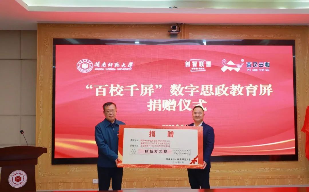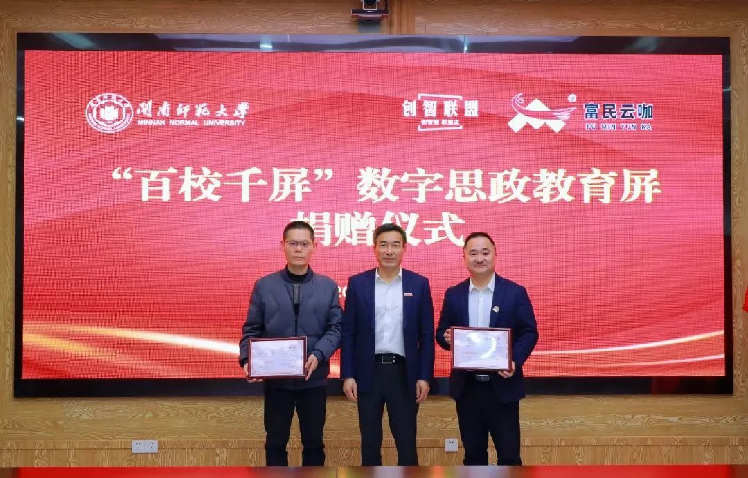3月2日下午,我校在科技樓1607會議室舉行“百校千屏”數字思政教育屏捐贈儀式。校黨委書記吳彬鏹、黨委副書記肖慶偉、福建創智聯盟教育科技公司總經理徐天白、福建富民云咖信息科技有限公司總裁鄭旺泉出席。捐贈儀式由校黨委宣傳部、統戰部部長徐繼紅主持。