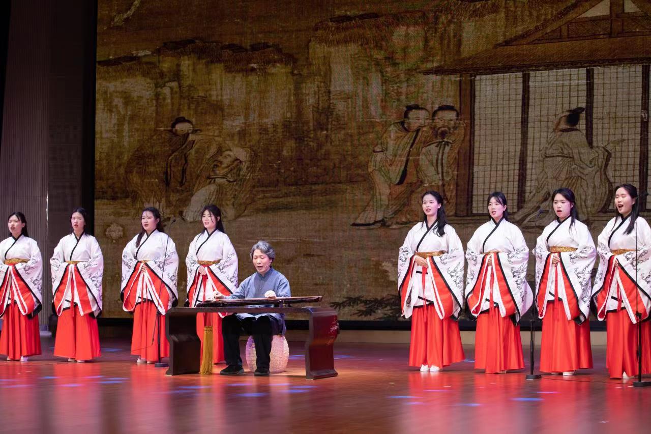 啟動儀式結束后舉行詩心琴韻弦歌晚會。弦歌,即撫琴而歌,是中國古琴藝術的重要表現形式之一。晚會現場,來自海峽兩岸的古琴名家和我校師生為觀眾帶來弦歌表演《大學》《詩經》《鹿鳴操》《流水》《長門怨》《酒狂》《陽關三疊》《春江花月夜》等經典曲目,琴音悠揚婉轉,歌聲情意真切。