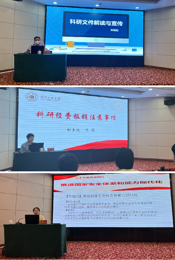 我校科研處處長林福財,財務處處長陳茜,宣傳部、統戰部副部長朱艷麗分別作報告