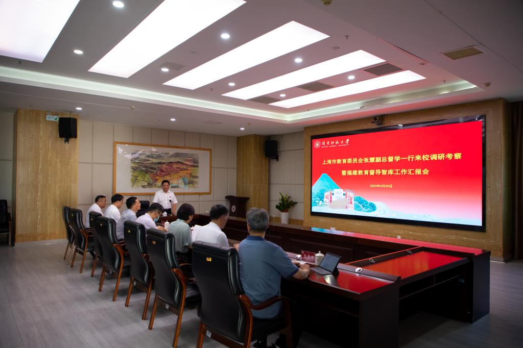 正值全黨深入開展學習貫徹習近平新時代中國特色社會主義思想主題教育之際,5月30日,上海市教委副總督學、二級巡視員張慧一行,與福建省教育廳專職副總督學黃建順一行來我校調(diào)研考察,并召開專題學習交流會,認真學習貫徹習近平總書記在中央政治局第五次集體學習時的重要講話精神,圍繞教育督導體制機制改革、加快建設教育強國等方面深入交流學習心得。校黨委書記、教育督導研究院院長吳彬鏹,黨委副書記、校長李順興出席,交流會由學校黨委常委、副校長張龍海主持。