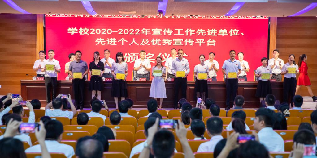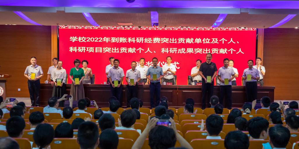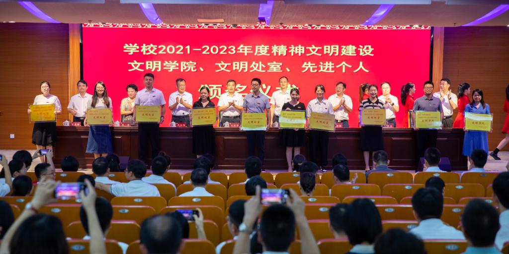在莊嚴(yán)的國(guó)歌聲中,大會(huì)正式開始。會(huì)上,校黨委副書記肖慶偉宣讀“龍江學(xué)者”特聘教授聘任決定,福建省優(yōu)秀教師、優(yōu)秀教育工作者表彰決定,2023年學(xué)校優(yōu)秀教師、優(yōu)秀教育工作者、優(yōu)秀班主任、優(yōu)秀研究生導(dǎo)師表彰決定,2021-2023年度精神文明建設(shè)文明學(xué)院、文明處室、先進(jìn)個(gè)人表彰決定以及2020-2022年宣傳工作先進(jìn)單位、先進(jìn)個(gè)人、優(yōu)秀宣傳平臺(tái)表彰決定。校黨委常委、副校長(zhǎng)張龍海宣讀2022-2023學(xué)年教學(xué)業(yè)績(jī)突出個(gè)人的表彰決定,以及在科研方面作出突出貢獻(xiàn)集體和個(gè)人的表彰決定。全體校領(lǐng)導(dǎo)為獲得表彰的單位和個(gè)人頒發(fā)榮譽(yù)證書、獎(jiǎng)牌和獎(jiǎng)杯。校黨委書記吳彬鏹向在科技創(chuàng)新成效顯著、科研取得重大突破的兩個(gè)科研團(tuán)隊(duì)代表李順興教授和張艷輝教授獻(xiàn)花。