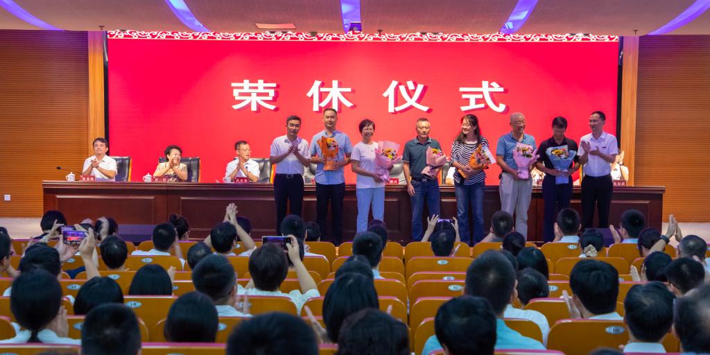 隨后,舉行新教師入職儀式和退休教職工榮休儀式。全體校領(lǐng)導(dǎo)為新入職教師代表佩戴校徽,新入職教師在大會(huì)上進(jìn)行莊嚴(yán)的入職宣誓。校黨委書記吳彬鏹、校長(zhǎng)李順興分別為退休教職工代表敬獻(xiàn)鮮花。