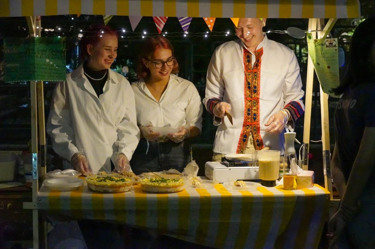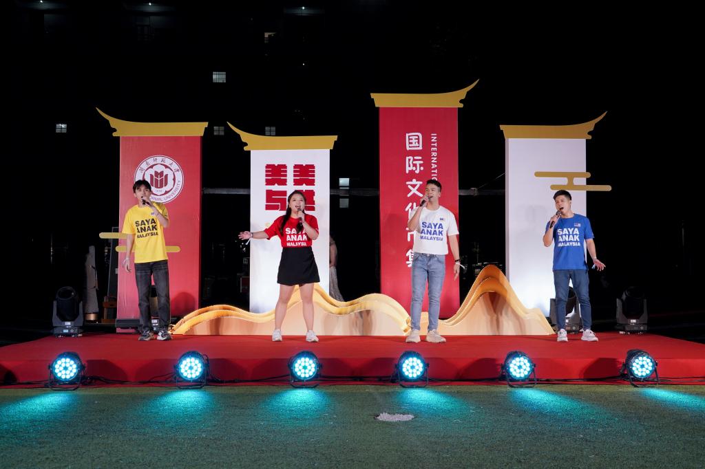 當晚,文藝匯演精彩紛呈。箜篌合奏《菊花臺,我和你》、國標拉丁舞《入畫江南》、民舞《美人關》講述悠久流長、底蘊深厚、開放包容的中華文明故事。東南亞國家學子帶來的熱情歌舞,瞬間點燃全場,表達了全人類實現“美美與共,天下大同”的美好愿景。即興互動環節中,臺灣學子帶來的閩南語歌曲《心花開》,抒發“兩岸一家親,閩臺親上親”的濃濃情誼。本次國際文化市集在全場合唱《稻香》的悠揚歌聲中,圓滿落下帷幕。