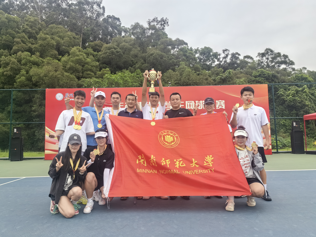 本次賽事由福建省教育廳主辦、廈門大學(xué)承辦,吸引了省內(nèi)28所高校的243名運(yùn)動員參加,分甲、乙、丙三個組別,下設(shè)混合團(tuán)體、男女單打、男女雙打等5個項(xiàng)目。我校網(wǎng)球隊(duì)?wèi){借精湛的球技和頑強(qiáng)拼搏的精神,在激烈的比賽中脫穎而出,除混合團(tuán)體冠軍外,還獲得體育專業(yè)組男單第一名、非體育專業(yè)組男單第一名等多個獎項(xiàng)。