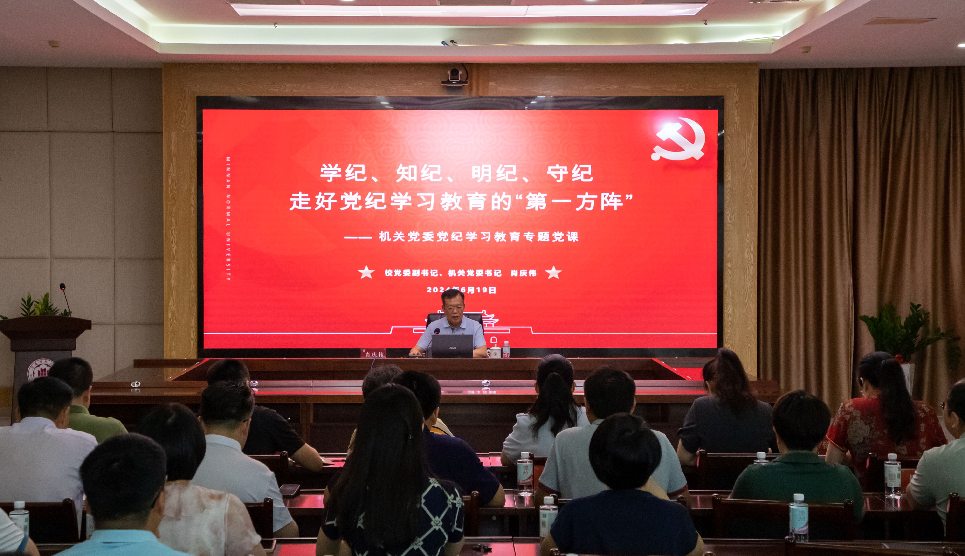 為推動學校黨紀學習教育走深走實,6月19日下午,校黨委副書記、機關黨委書記肖慶偉以《學紀、知紀、明紀、守紀 走好黨紀學習教育的“第一方陣”》為題,為機關教輔單位、聯系學院以及“青馬工程”青年干部培訓班的黨員干部講授黨紀學習教育專題黨課。黨課由校黨委組織部部長、機關黨委副書記趙麗霞主持。