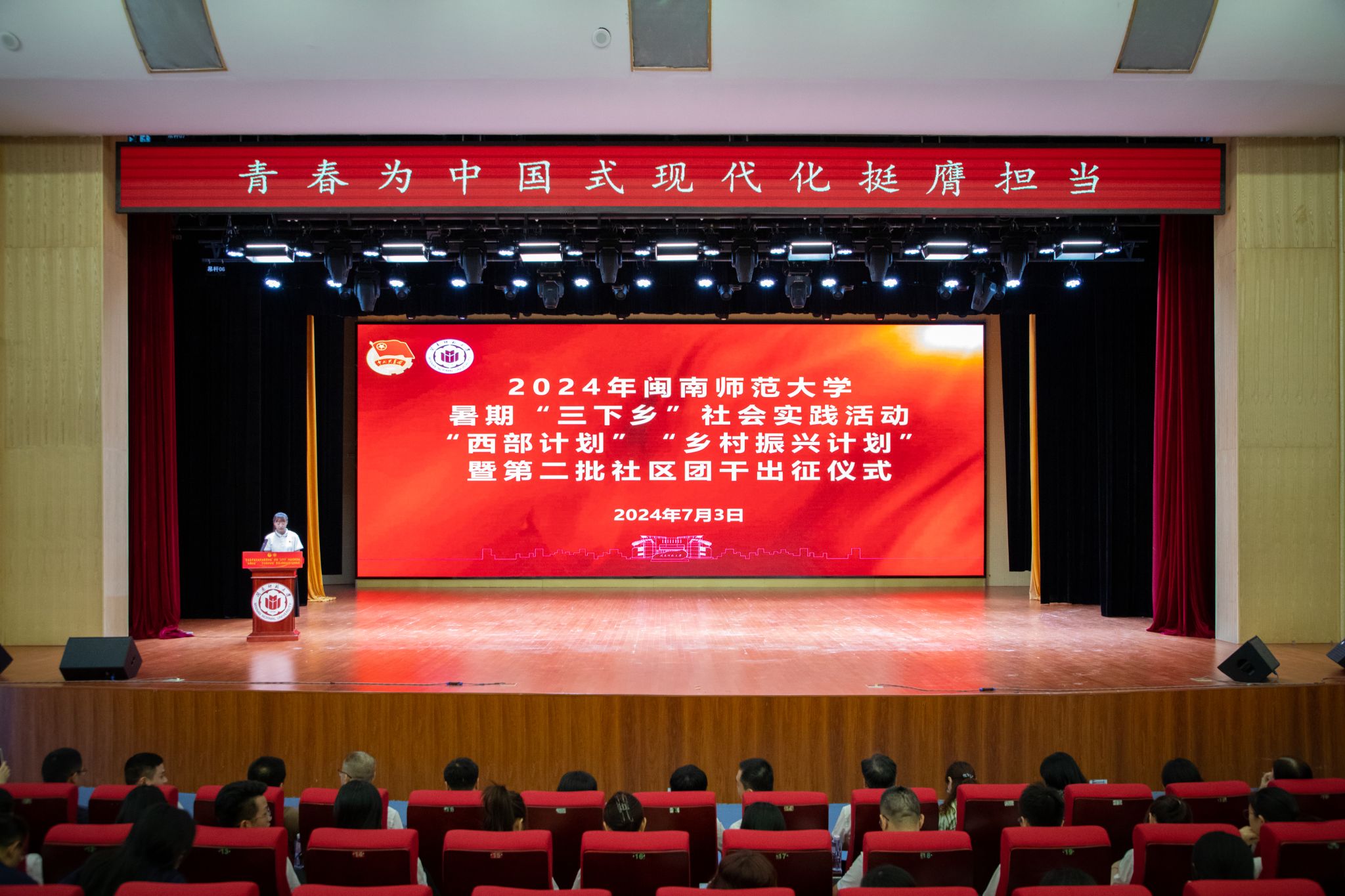 7月3日,2024年閩南師范大學暑期“三下鄉”社會實踐活動、“西部計劃”“鄉村振興計劃”暨第二批社區團干出征儀式在閩南文化藝術中心多功能廳舉行。校黨委副書記林致遠出席。校黨委宣傳部、統戰部、學生處、教務處、團委、馬克思主義學院、文學院負責人,各二級學院分管學生工作副書記、團委書記,學生處、校團委機關全體人員,帶隊教師、各實踐隊代表、“西部計劃”“鄉村振興計劃”錄取志愿者代表、第二批社區團干代表等參加。校團委副書記童娟主持儀式。