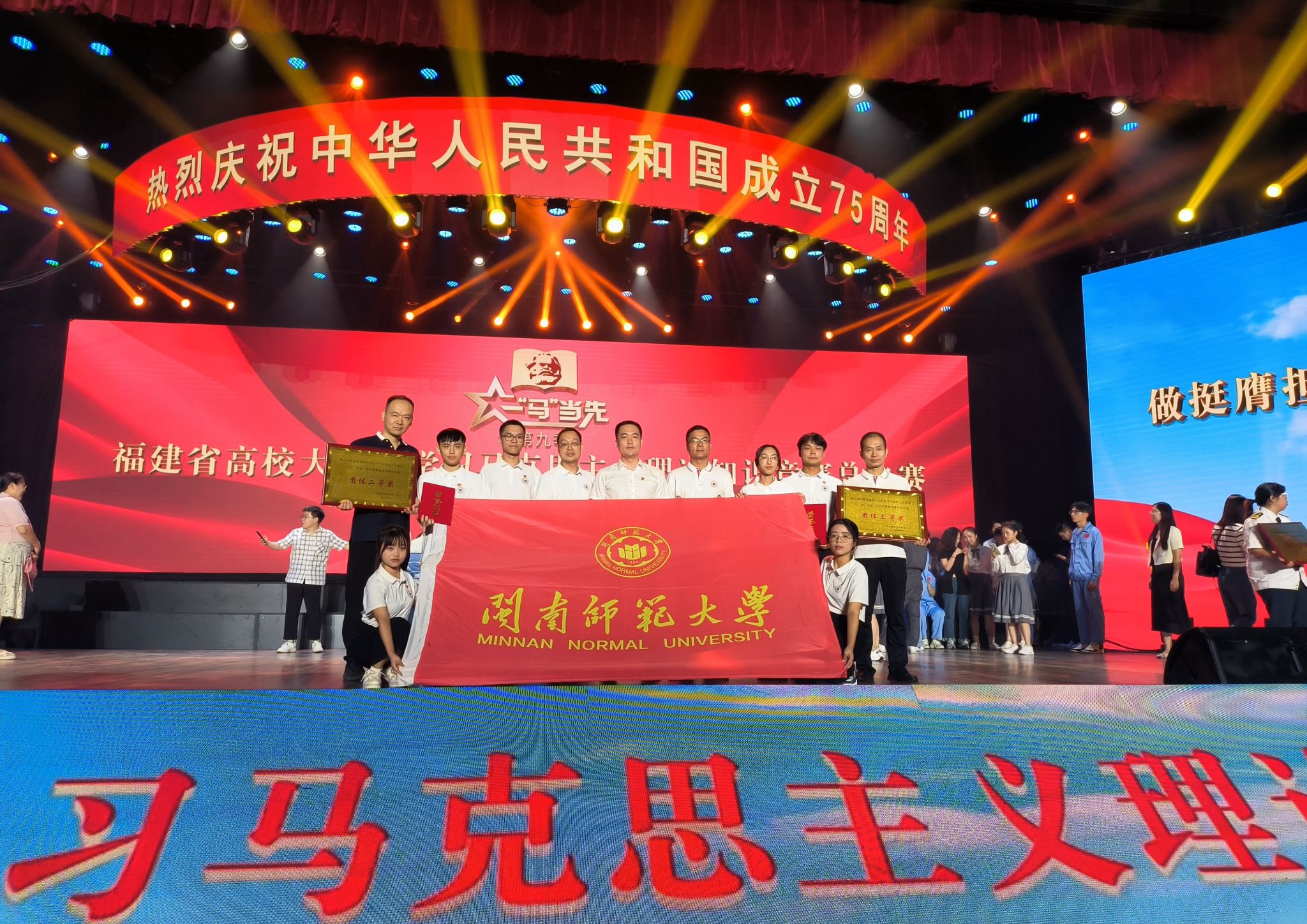 9月26-27日,由中共福建省委教育工委主辦的第九季福建省高校大學生學習馬克思主義理論“一‘馬’當先”知識競賽總決賽在福州大學舉行,來自全省各高校的30支隊伍會師決賽賽場。我校榮獲研究生組團體二等獎,本科生組團體三等獎。其中,2023級思想政治教育專業林倩茹、周珺同學榮獲研究生組個人三等獎。