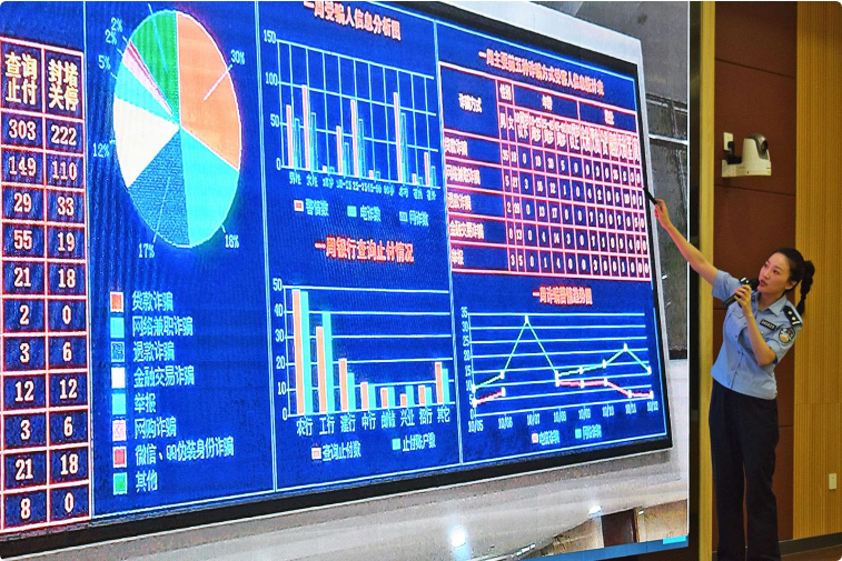市反詐騙中心民警用大數據圖標分析了當前詐騙數量、詐騙方式、受騙人信息及銀行止付情況。數據顯示,貸款詐騙占總詐騙數量的30%,網絡兼職、金融交易、網購退款等詐騙方式也占有較高比例。