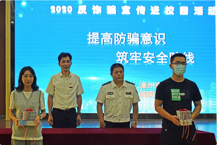 講座前,閩南師大黨委副書記鐘發亮與漳州市公安局黨委委員、刑偵支隊長紀建仁共同為新生代表贈送自制防騙宣傳動漫光盤和5000份手冊。并要求同學們廣而告之,警惕身邊人上當受騙。