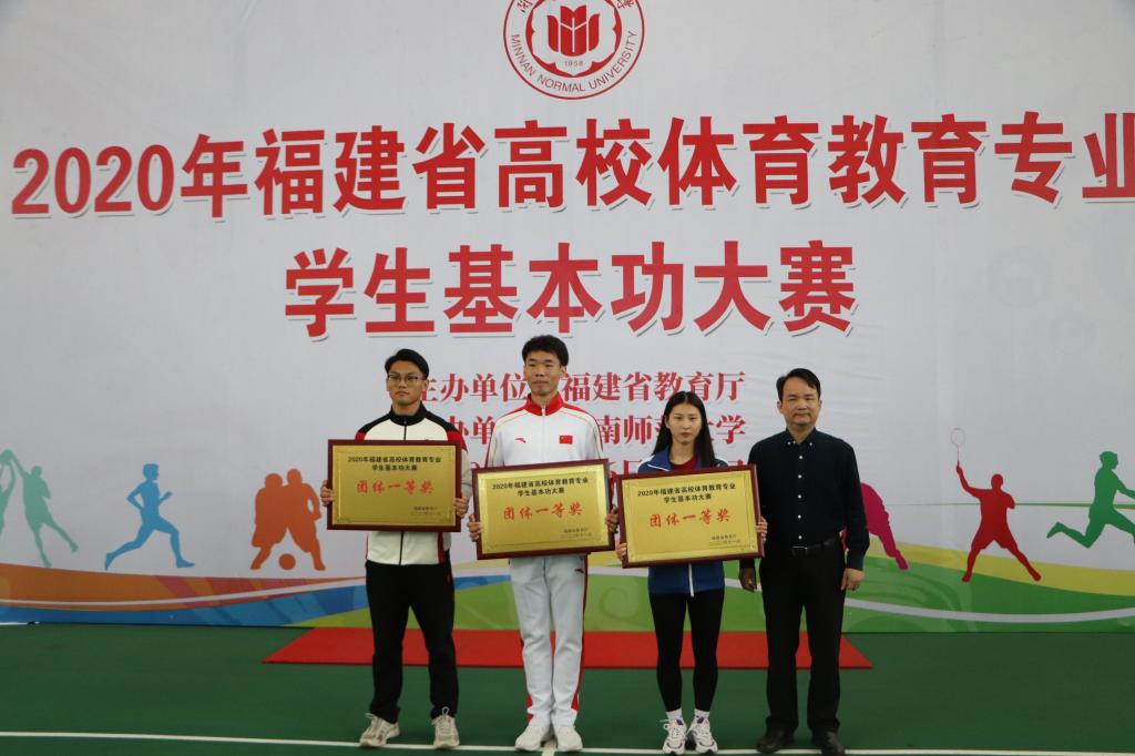 11月27日—29日,2020年福建省高校體育教育專業學生基本功大賽在閩南師范大學舉行,來自全省9所高校的體育教育專業學生共同比拼基本功。經過三天激烈的角逐,閩南師范大學、福建師范大學、泉州師范學院分別獲得團體總分前三名,并獲團體一等獎;三明學院、集美大學、龍巖學院獲團體二等獎;寧德師范學院、莆田學院、華僑大學獲團體三等獎。福建省教育廳體衛藝語處副處長鐘慶林宣讀獲獎名單,閩南師范大學黨委常委、副校長張龍海,福建省教育廳體衛藝語處原調研員陳麗紅,福建技術師范學院體育學院院長林正梅為獲獎隊伍頒獎。
