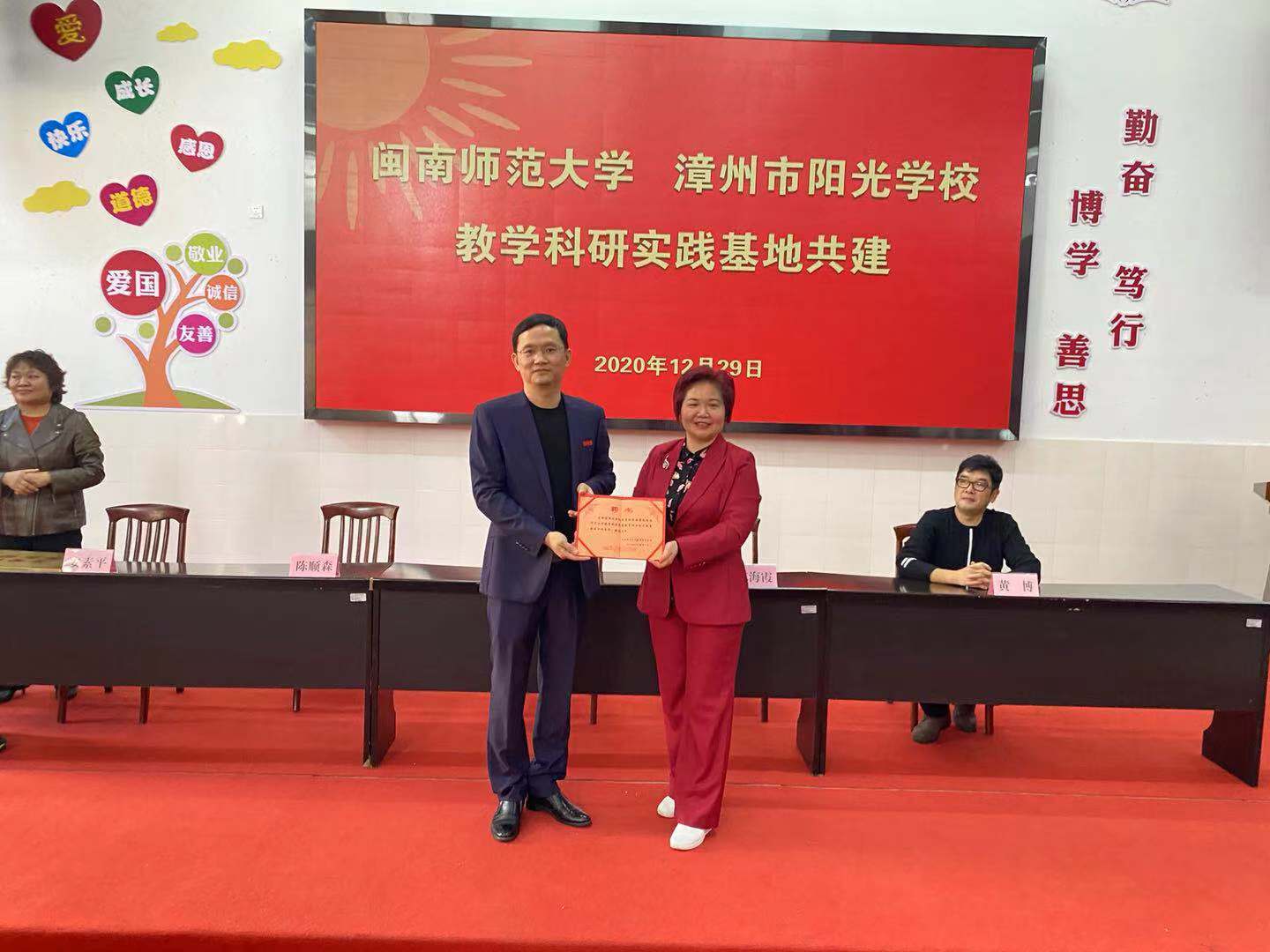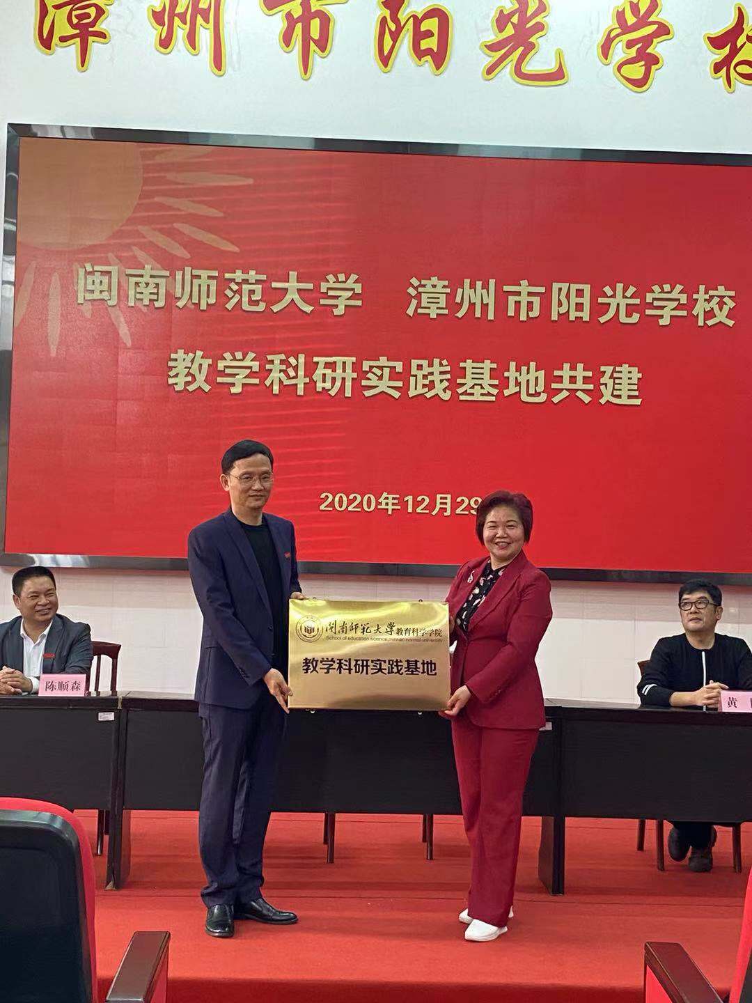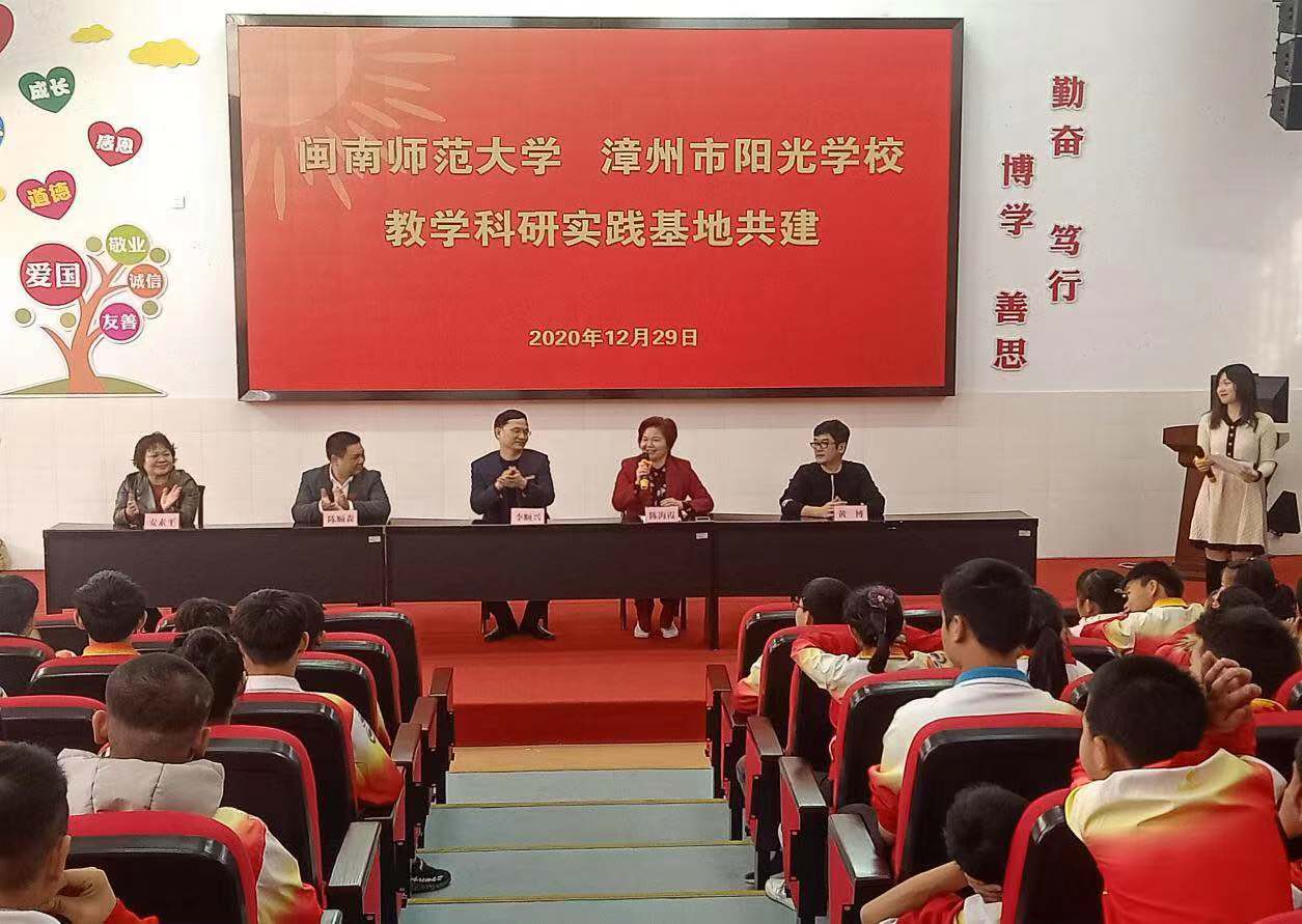 為進一步強化教學管理,進一步深化教學改革,進一步優化生源質量,為社會培養更多的人才。2020年12月29日上午10:00,閩南師范大學在漳州市陽光學校舉行了教學科研實踐基地授牌儀式活動。參加此次授牌儀式的有閩南師范大學李順興校長,閩南師范大學教育科學學院陳順森院長,閩南師范大學教育科學學院安素平教授,以及漳州市陽光學校陳海霞校長,漳州市陽光學校黃博書記等全體師生。