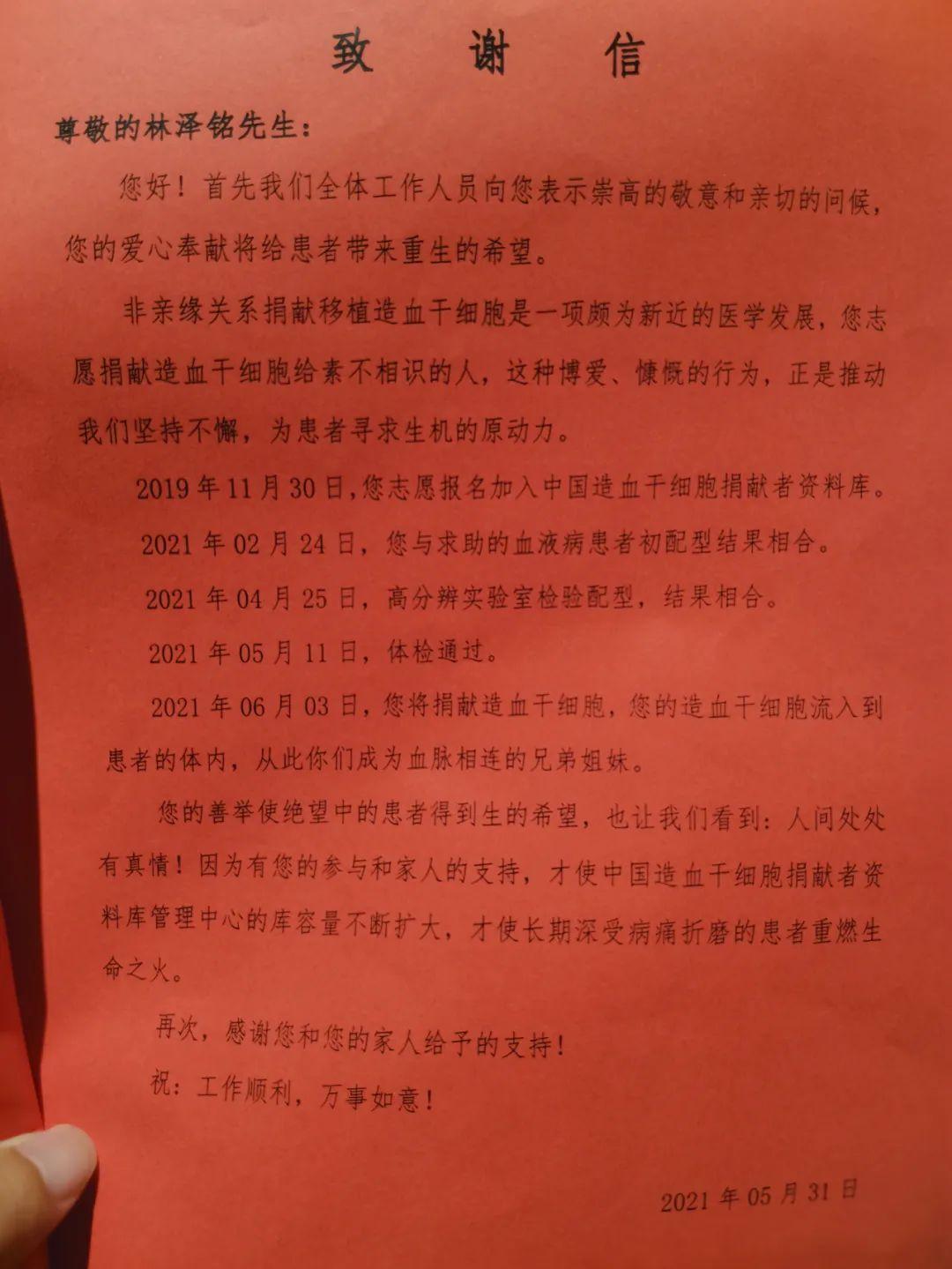 福建日報·新福建客戶端6月4日訊 (通訊員 李小薈 文/圖)6月3日,閩南師范大學物理與信息工程學院2021屆畢業生林澤銘收到了一份特殊的感謝信。當天,他成功地捐獻了造血干細胞,為千里之外素不相識的血液病患者送去“生命火種”,讓長期深受病痛折磨的陌生患者重燃生命的希望。