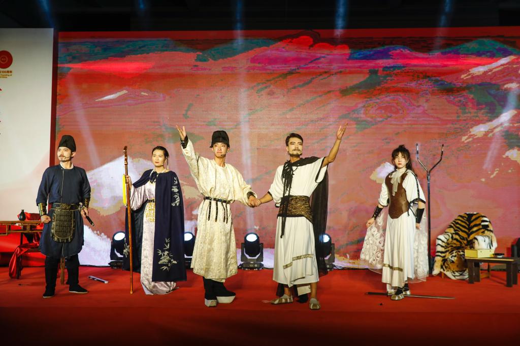 文藝晚會以“永遠跟黨走”為主線,通過黨建帶團建的形式,以青年大學生為演出主體,融合了非遺表演、舞臺劇、歌曲、朗誦、視頻展映等多種藝術形式,深情表達了新時代青年對先賢和革命先烈的崇敬,以及中國人民毫不動搖永遠跟黨走的堅定信念。