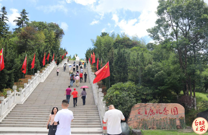參觀完古田會議會址,臺灣教師一行來到毛主席紀念園。大家拾級而上,走過151級攀登臺階,來到毛主席雕像前。這是一座漢白玉毛澤東雕像,毛澤東雕像身穿風衣,左手拿著一頂圓舌帽,右手揮起,雙目注視前方,凝望著這片土地。大家佇立仰視、莊嚴鞠躬、緩步繞行。