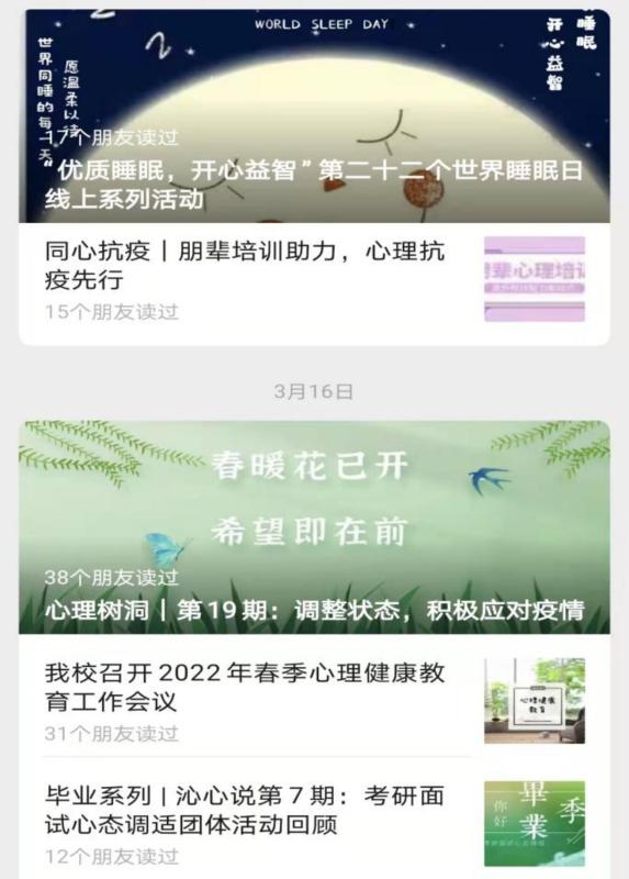 該校原創(chuàng)心理微電影《確幸》在校園首映,榮獲首屆全國(guó)高校心理微電影大賽百佳作品,學(xué)習(xí)強(qiáng)國(guó)點(diǎn)擊量達(dá)近19萬(wàn)人次;開(kāi)展“優(yōu)質(zhì)睡眠,開(kāi)心益智”第22屆世界睡眠日系列活動(dòng),舉辦《談?wù)勊吣切┦隆飞暇€講座和“正念放松助力睡眠”線上活動(dòng);針對(duì)畢業(yè)生考研求職面試現(xiàn)實(shí)心理需求,舉辦“沁心說(shuō)”考研面試心理賦能團(tuán)體和面試心態(tài)調(diào)整團(tuán)體活動(dòng);二級(jí)學(xué)院心理健康輔導(dǎo)站還推出《疫情再度來(lái)襲,我們應(yīng)如何調(diào)整心理》系列推文,舉辦“我的青春不虛度”主題心理漫畫(huà)大賽、心理主題班會(huì),營(yíng)造積極向上校園文化氛圍。