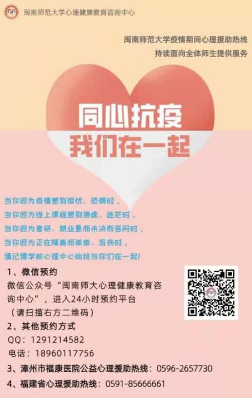 閩南師范大學(xué)心理健康教育咨詢中心迅速成立沁心熱線服務(wù)隊(duì),于3月18日開(kāi)通“同心抗疫,我們?cè)谝黄稹?種心理支持服務(wù)方式,通過(guò)心理支持熱線電話、遠(yuǎn)程在線心理輔導(dǎo)、心靈氧吧,解答師生心理困惑,舒緩壓力。