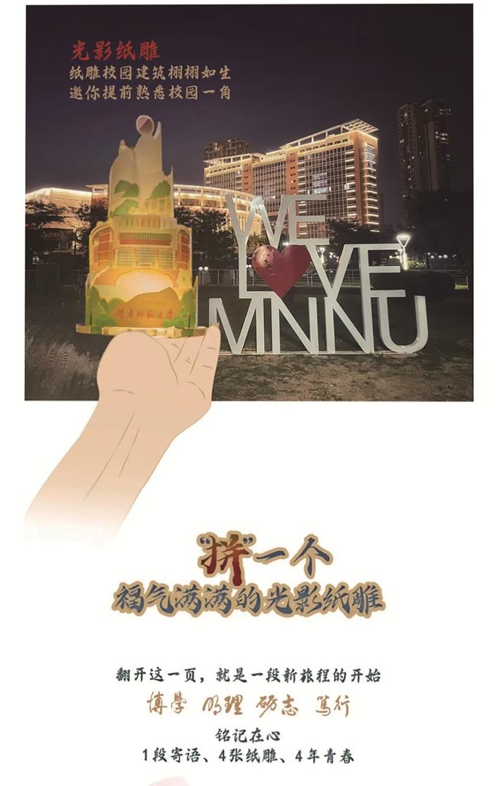 除了錄取通知書,一同為新生們寄出的還有口罩、閩南師大卡套、閩南師大長卷、新生手冊、光影紙雕。其中,4張紙雕代表4年青春,可由學子們自己動手“拼裝”,點燈即亮,愿大一新生能用細心、認真、堅持,“拼”出一個發光的未來。