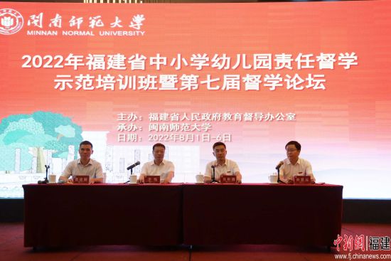 中新網福建新聞8月2日電(汪敏 陳燕玲) 8月2日上午,由福建省人民政府教育督導辦公室主辦、閩南師范大學承辦的2022年全省中小學幼兒園責任督學示范培訓班在漳州開班。福建省政府教育督導委員會委員、省教育廳副廳長李絢出席并講話,國家特約教育督導員、閩南師大黨委書記、教育督導研究院院長吳彬鏹致辭。開班式由省政府督學顧問、閩南師大黨委常委、副校長林致遠主持。