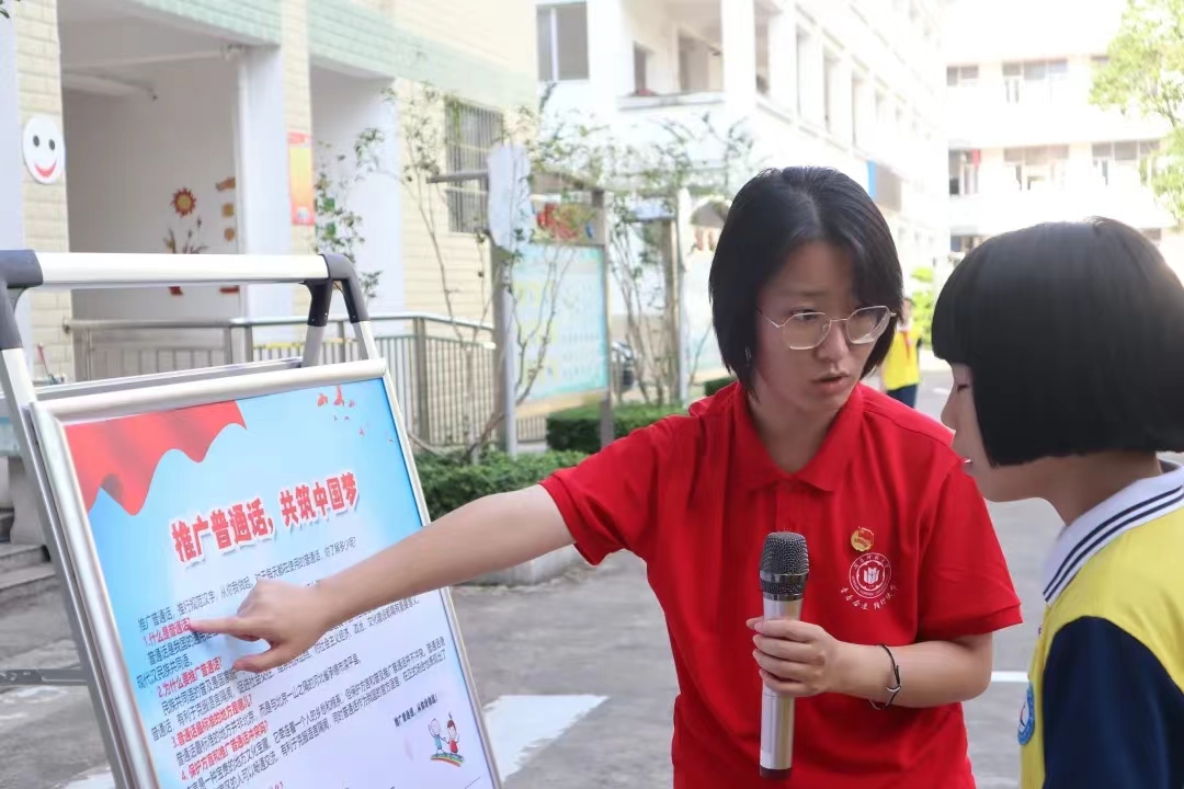 為將普通話推廣落到實處,實踐團成員面向新圩鎮(zhèn)的小朋友進行普通話推廣,利用宣傳板普及普通話小知識,帶領小朋友們學習朗讀宣傳板內(nèi)容,結(jié)合口頭介紹平舌翹舌等讀音并糾正其讀音的方式,引導小朋友們講好普通話,做普通話的實踐者和傳播者。