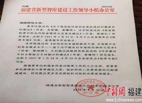 圖為教師黨員調(diào)研報(bào)告獲省領(lǐng)導(dǎo)批示,閩南師范大學(xué)供圖