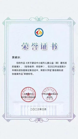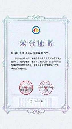 由鄭容坤老師指導,黃睿冰同學的提案作品《關于建設中小城市兒童公益(寒)暑托班的提案》聚焦中小城市家庭寒暑假期間兒童“看護難”問題,調研兒童公益(寒)暑托班實際運營情況,提出完善相關政策,創設“一對一”幫扶體系等相關建議,作品獲評全國“最佳模擬政協提案作品”。由林慧老師指導,何詩鏵等同學的提案作品《關于雙減政策下推動青少年體育發展的提案》關注青少年體育教育現狀,從招錄要求、合作渠道、法律規范以及教育模式四個方面提出具體解決方案,作品獲評全國“優秀模擬政協提案作品”。