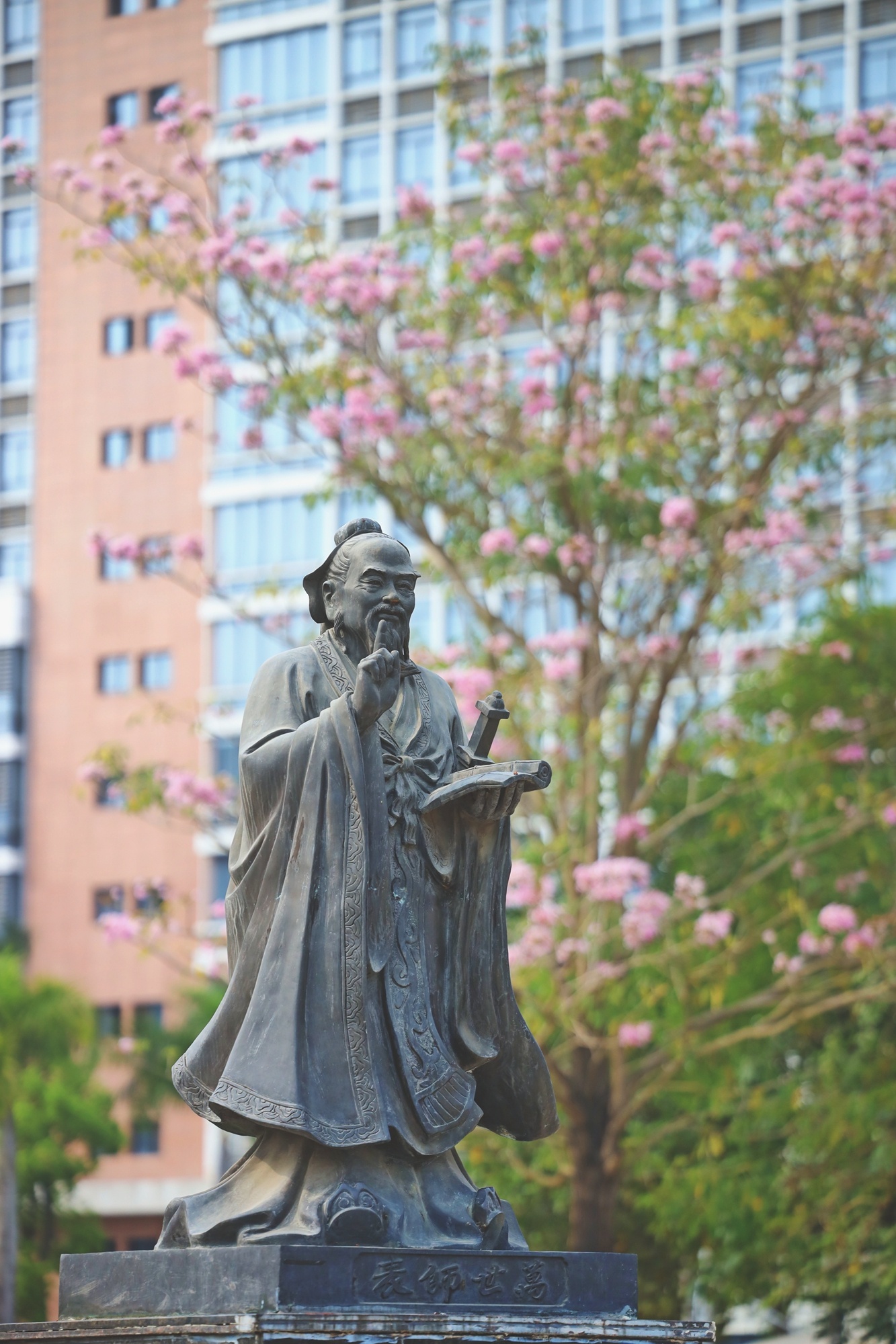 閩南師范大學(xué)鉆石廣場前,孔子像手捧長卷佇立,在春光里靜靜注視著行色匆匆的學(xué)子。