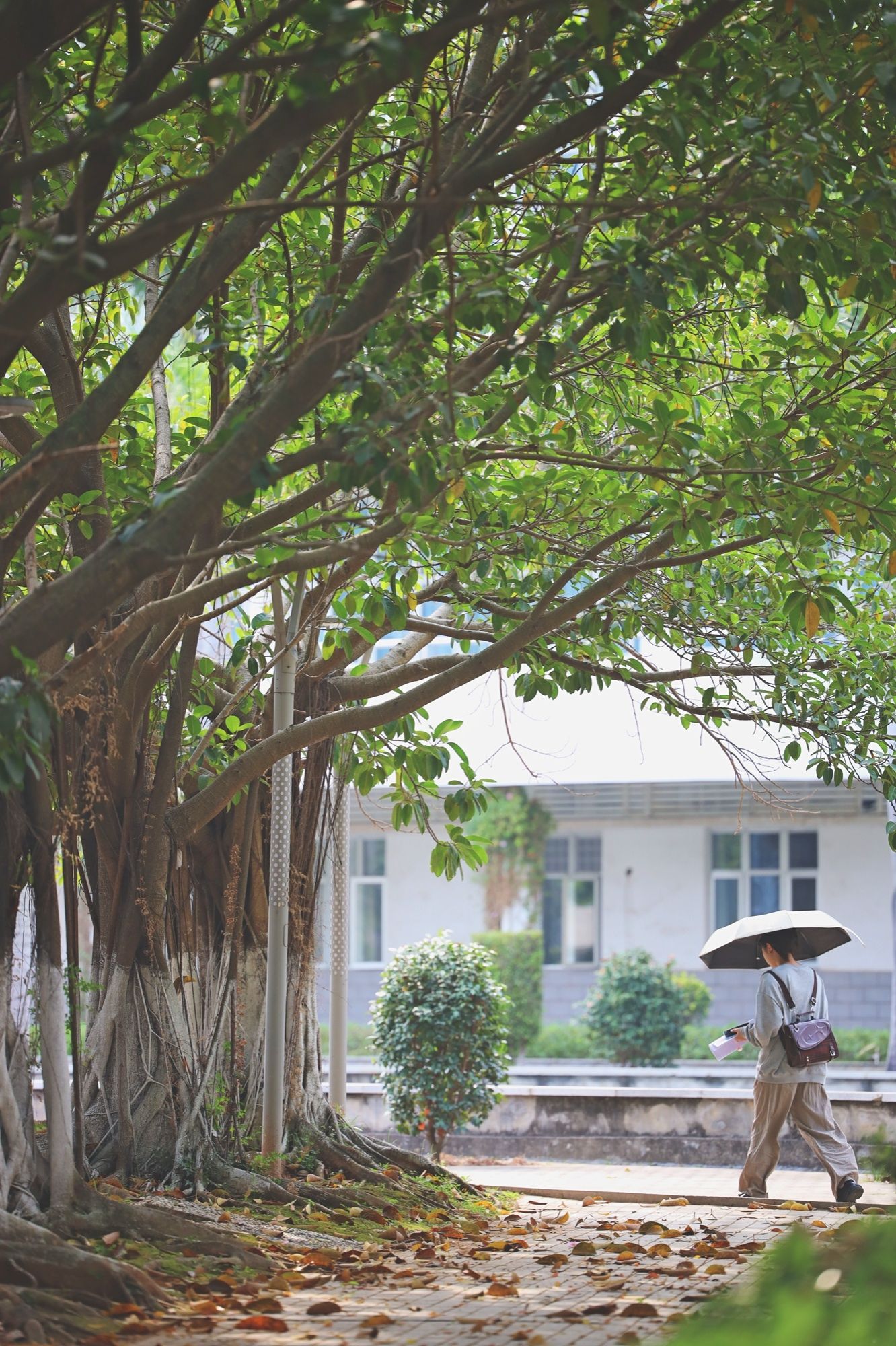 圖書館小徑旁的榕樹站成一列,枝葉延伸出一片綠蔭,為暖洋洋的春光帶來了一絲清涼。