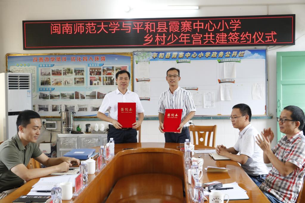 8月27日,由校黨委宣傳部牽頭,校團委、教育科學學院等相關單位領導前往霞寨中心小學進行實地調研及座談,并舉行閩南師范大學與平和縣霞寨中心小學鄉村少年宮共建簽約儀式。平和縣文明辦、平和縣教育局、霞寨鎮政府等領導及霞寨中心小學全體領導班子出席本次活動。我校一行參觀了霞寨中心小學校園、少年宮活動室、學生公寓等,聽取了霞寨中心小學校長黃國棟對學校概況、少年宮建設現狀及薄弱環節等情況的介紹。校黨委宣傳部部長徐志懷等同志就發揮學校優勢,著力把共建與精準幫扶、實習實踐、文化志愿服務、大學生社會實踐等工作緊密結合起來,提升輔導水平和活動質量,共同推動霞寨中心小學少年宮持續健康發展等方面與霞寨中心小學有關領導進行深入交流。