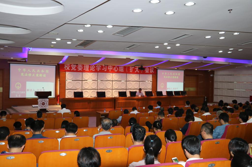 為進一步做好《中華人民共和國憲法修正案》學習宣傳,11月15日下午,校黨委在逸夫圖書館五樓報告廳召開理論學習中心組(擴大)會,專題學習憲法修正案。全體在家校領導,全校副科級及以上干部,全校黨支部書記、各民主黨派、無黨派人士及統戰團體負責人,各級人大代表、政協委員,“四有”青年教師卓越班全體學員等近400人參加會議。會議由校黨委宣傳部長徐志懷主持。