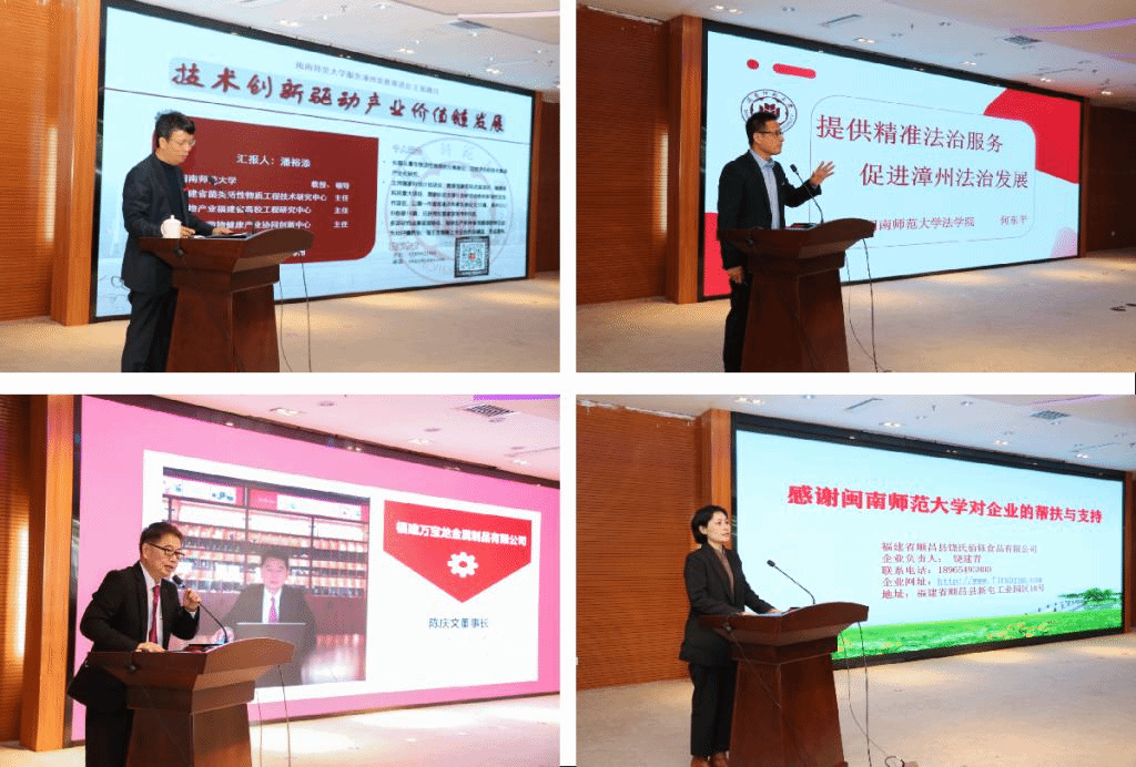 我校專家代表菌物工程中心主任潘裕添教授、法學院院長何東平教授,企業代表萬寶龍(漳州)金屬制品有限公司董事長陳慶文、福建省順昌縣饒式佰鈺食品有限公司辦公室主任應麗華在會上發言。