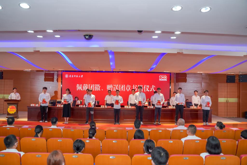 校領(lǐng)導(dǎo)為新團(tuán)員代表贈送團(tuán)章和書籍