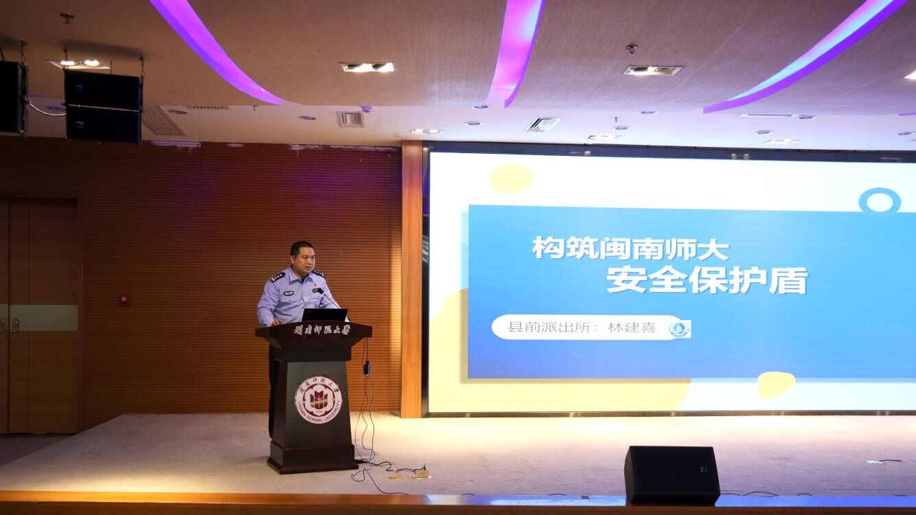 漳州市公安局縣前派出所林建喜教導員結合近期漳州各高校嚴峻的反詐騙形勢,用大量案例強調做好高校防詐反詐工作和治安維穩工作的緊迫性和重要性。他詳細介紹了常見的電信網絡詐騙手段,以及目前校園其他治安維穩問題,希望全校師生牢記防詐反詐“六個一律”“三不一及時”,進一步提高反詐騙意識。