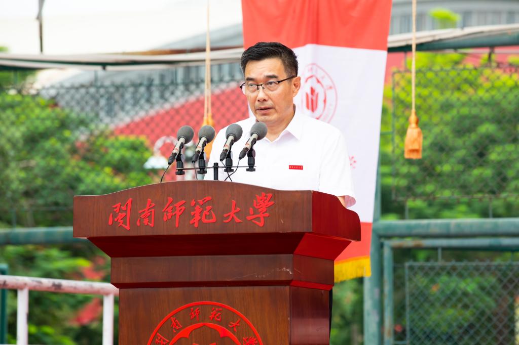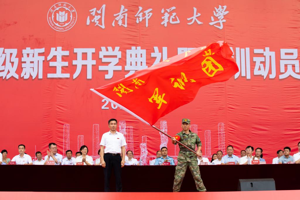 校黨委書記吳彬鏹向閩南師范大學軍訓團、閩南師范大學圓山營教官代表授旗