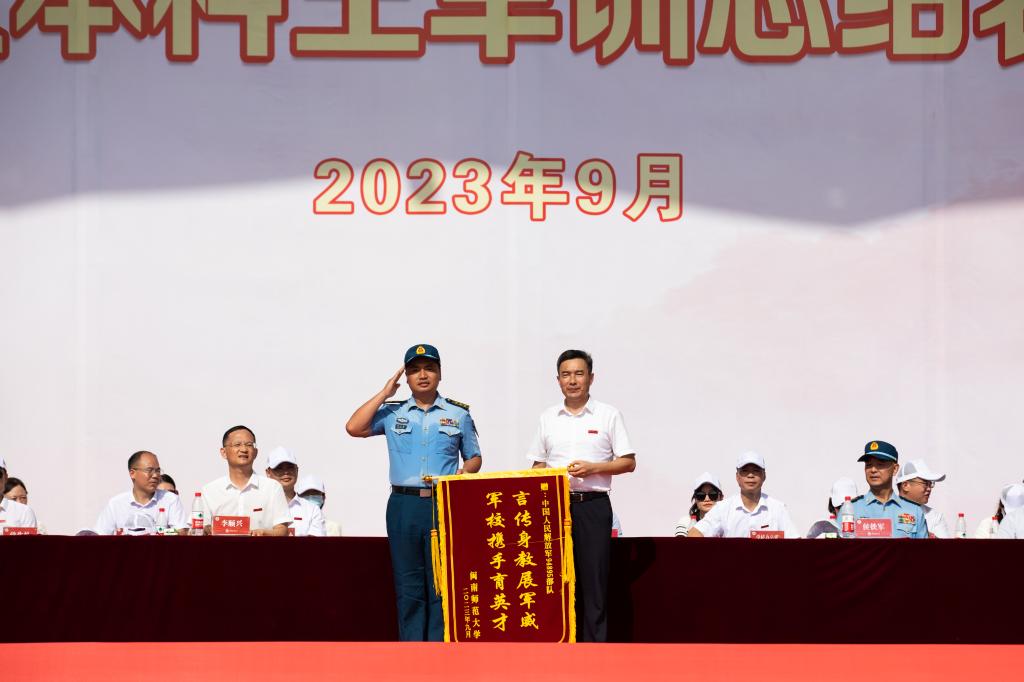吳彬鏹代表學校向承訓部隊贈送錦旗,對承訓部隊官兵為期三周辛勤付出表示敬意和感謝。在全場齊唱《強軍戰歌》和《歌唱祖國》中,2023級本科生軍訓總結表彰大會圓滿落下帷幕。