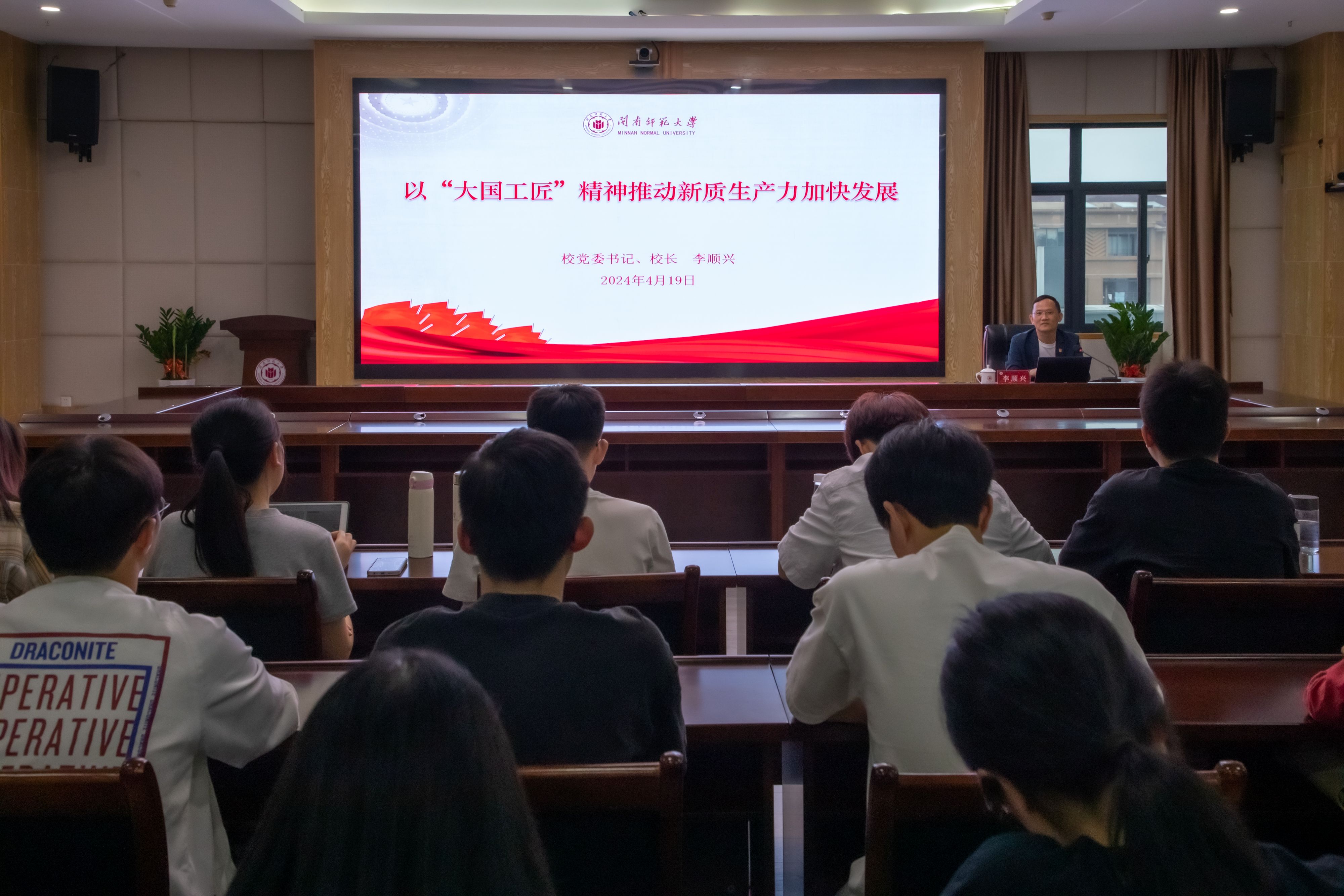4月19日,校黨委書記、校長李順興在科技信息樓1607會議室為研究生作題為《以“大國工匠”精神推動新質生產力加快發展》的形勢政策報告。