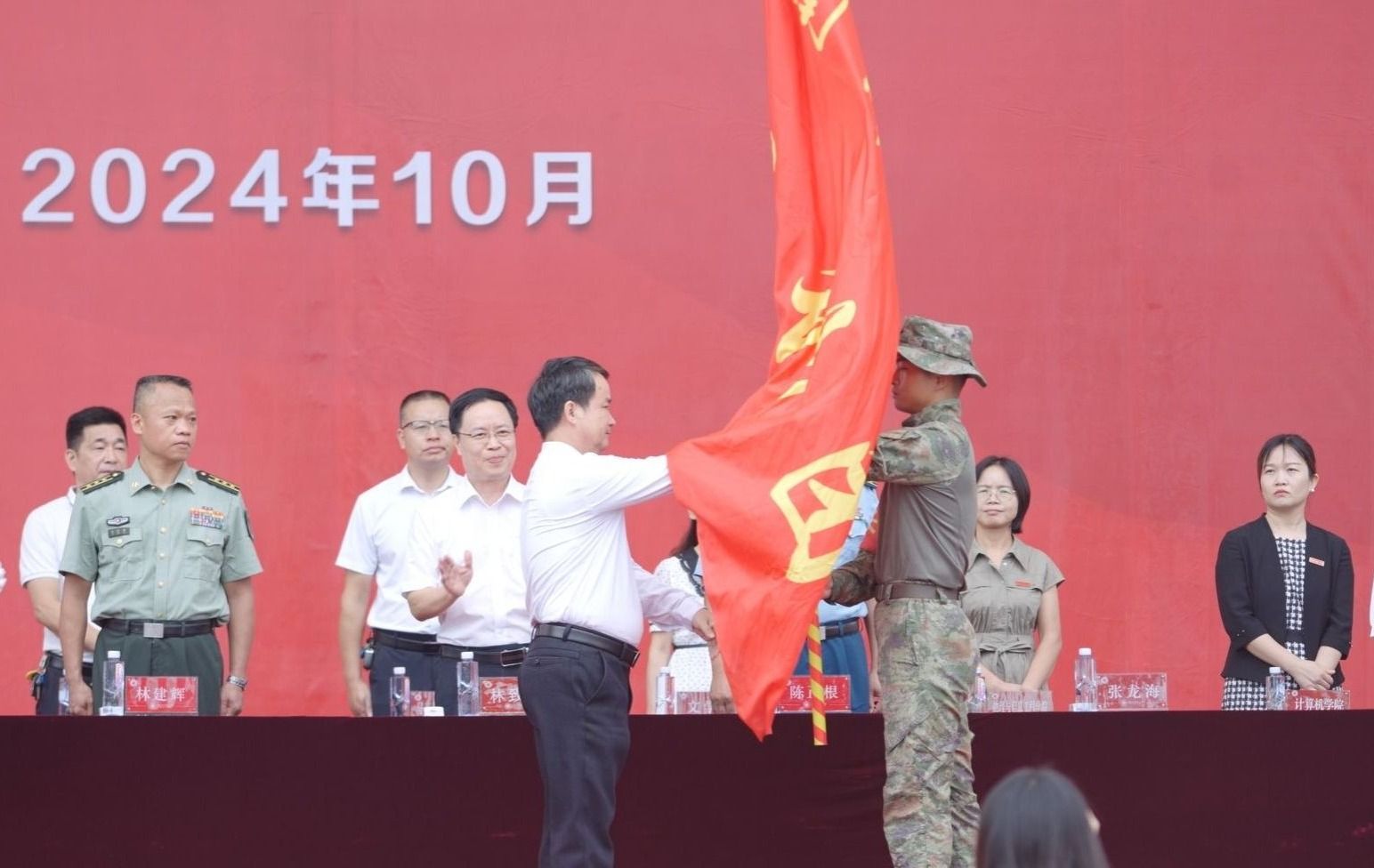 張龍海向閩南師范大學(xué)軍訓(xùn)團(tuán)授旗。軍訓(xùn)團(tuán)旗迎風(fēng)飄揚(yáng),我校2024級(jí)學(xué)生軍訓(xùn)正式拉開(kāi)序幕。