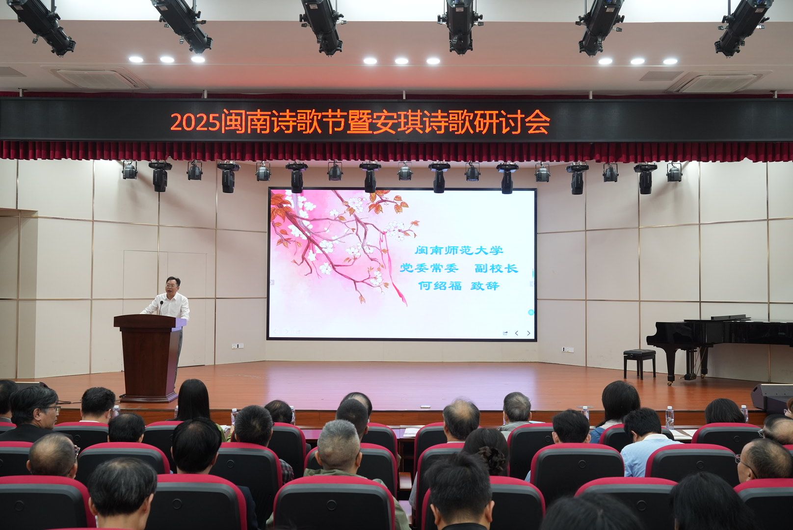校黨委常委、副校長何紹福在開幕式上致辭。他表示,閩南師范大學閩南詩歌節至今已經舉辦十屆,現已成為閩南地區文學文化交流的重要平臺和品牌活動,希望與會嘉賓以詩為媒,深入交流探討閩南文化,讓詩韻連接兩岸,加深對中華優秀傳統文化的理解和認同,增強文化自信。